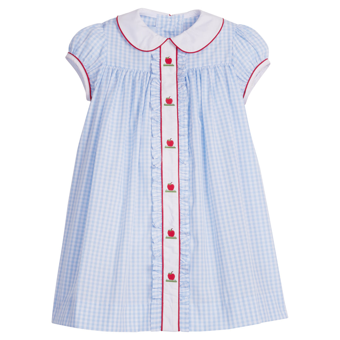 Get ready for a sweet start to the school year with our vintage-inspired School Days Collection! This charming blue gingham dress features capped sleeves, a peter pan collar, and ruffled placket all trimmed in red. The embroidered apples down the front make this look picture day perfect and baby sister can match easily in our Ruffled Sally Bloomer Set.