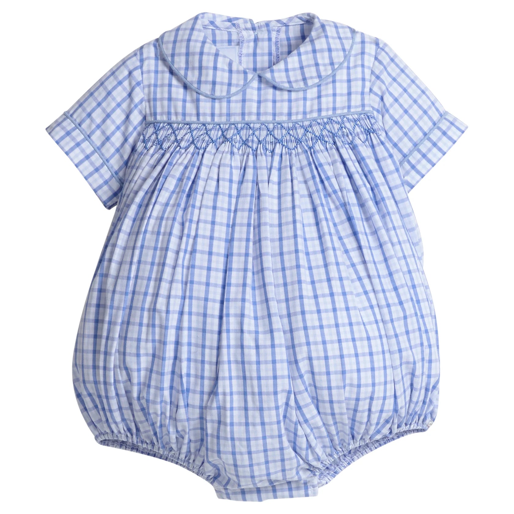 The Woodberry Collection features a rich blue plaid that's perfect for sibling matches and family photos! Little English's hand-smocked Barrington Bubble is a classic style for baby boy with short sleeves and a peter pan collar. This heirloom-worthy one-piece is a wonderful addition to your little one's wardrobe.