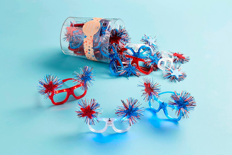 Light-up tinsel pom glasses. Ages 3+. Batteries included.