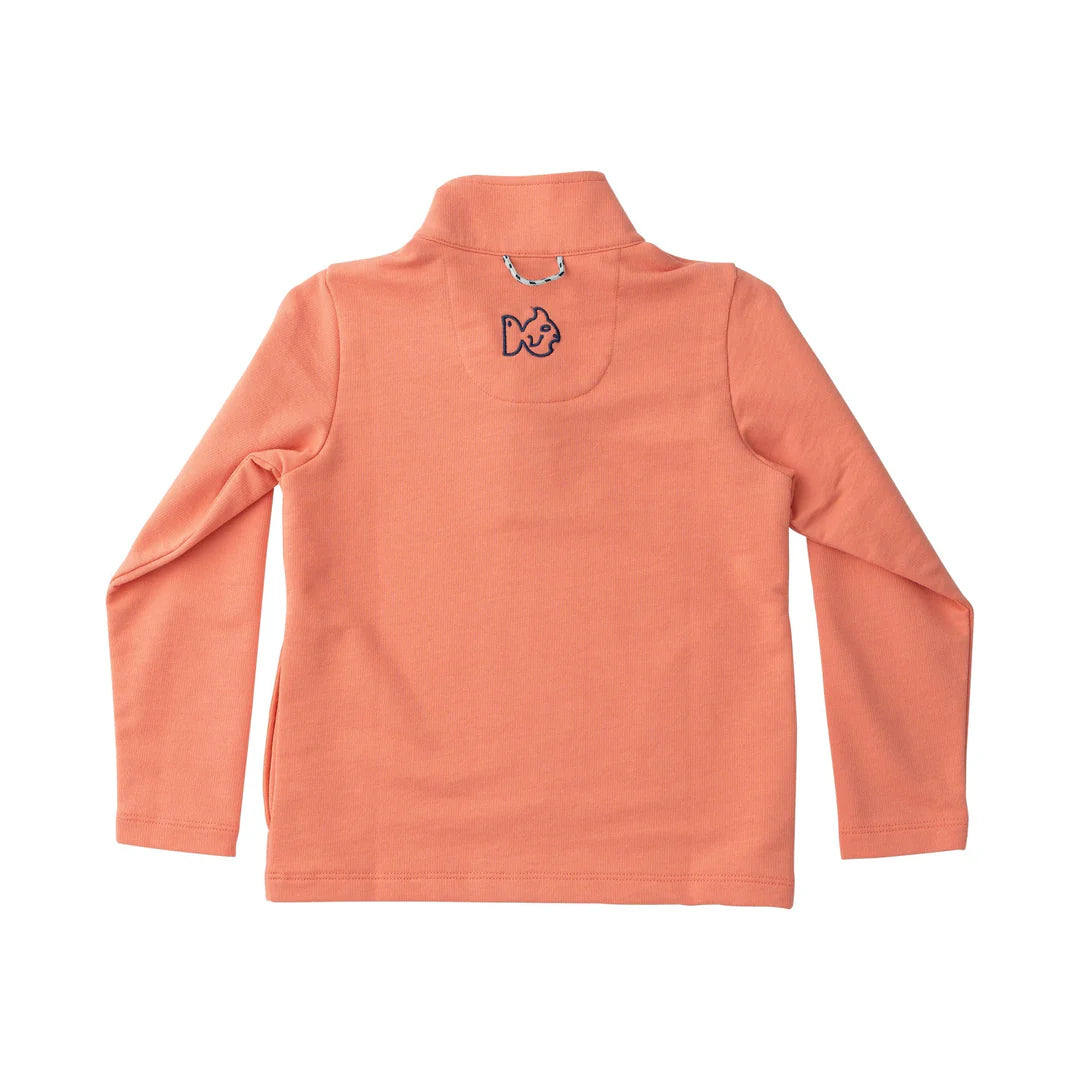 Your little gent just leveled up his play-all-day and picture ready wardrobe. This Boys Sporty Snap Pullover in Crabapple Orange and Plaid Liner is lightweight enough for layering and durable for rough and tumble adventures. It comes in a cheerful coastal coral hue with a contrast striped lining that adds a pop of prep. Easy to toss on and even easier to love, this pullover is a mom approved must have for every season. Great for school, sports, and outdoor play!