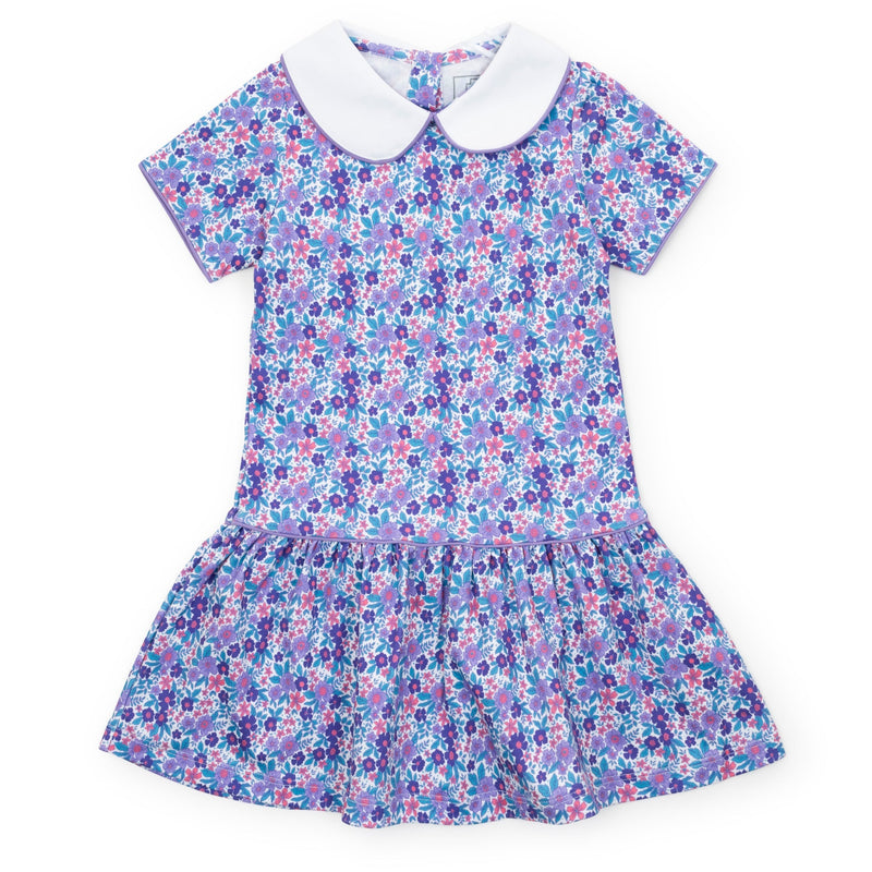 Short sleeve pima cotton dress with peter pan collar and contrast piping. Button closure up the back. Drop waist ruffled skirt.