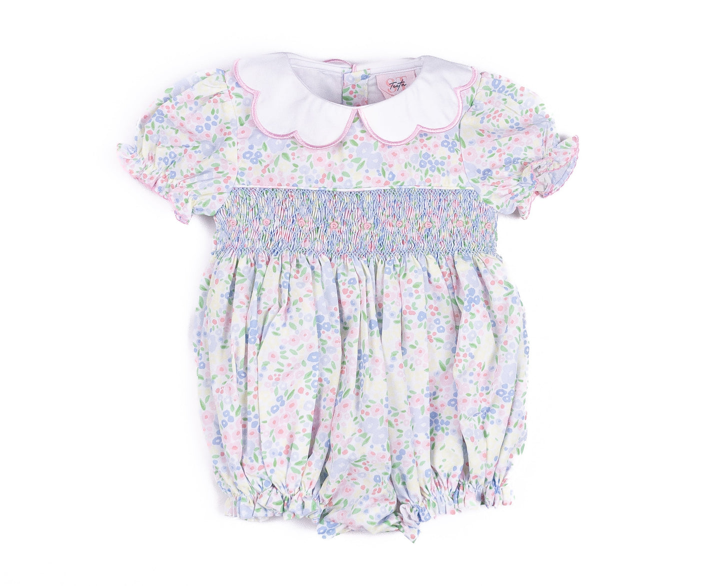 Introducing the Shop Teeta Ashley Floral Casey Bubble—a delightfully charming piece that captures pure sweetness! This adorable bubble features a gorgeous smocked floral design that's perfect for your little girl.
